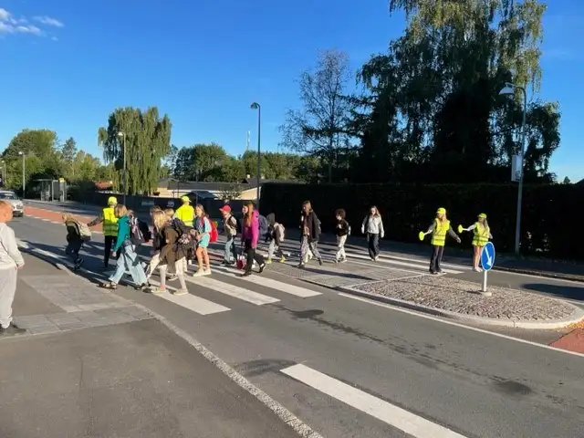 Vores skolepatruljen hjælper, at eleverne der kommer med bussen kommer sikkert over vejen.